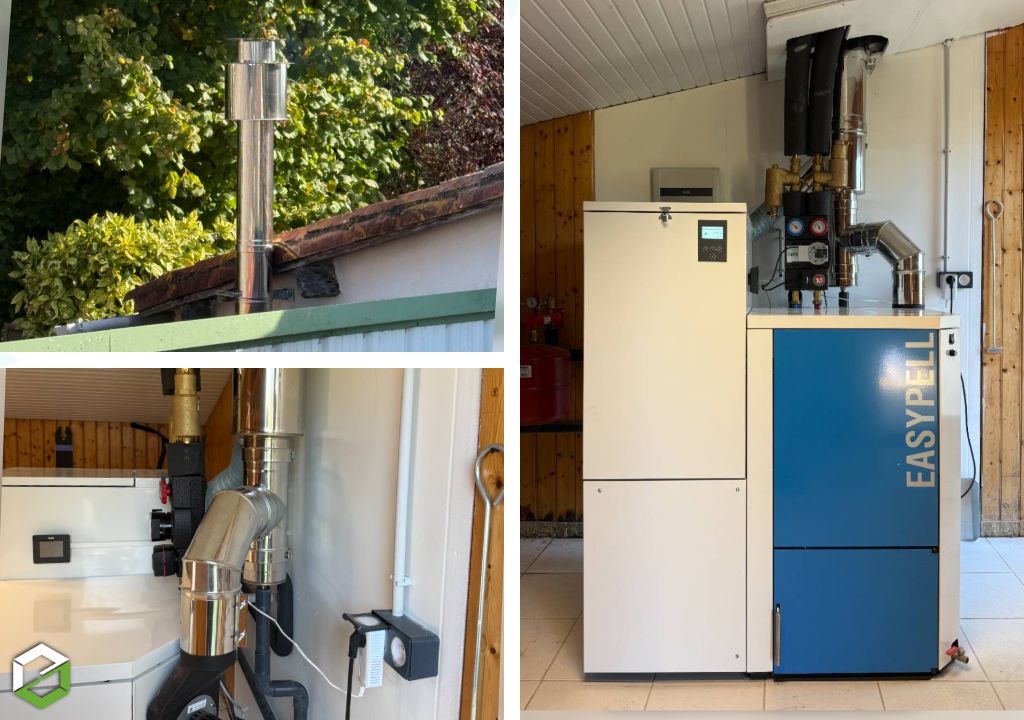 Sans conduit de cheminée existant nous avons installé un chaudière à granulés de bois pellets ventouse ( POUJOULAT ) dans une partie attenante à l'habitation.