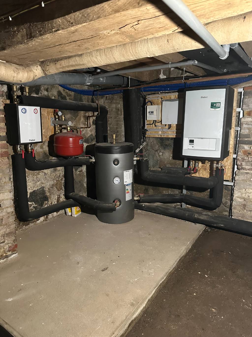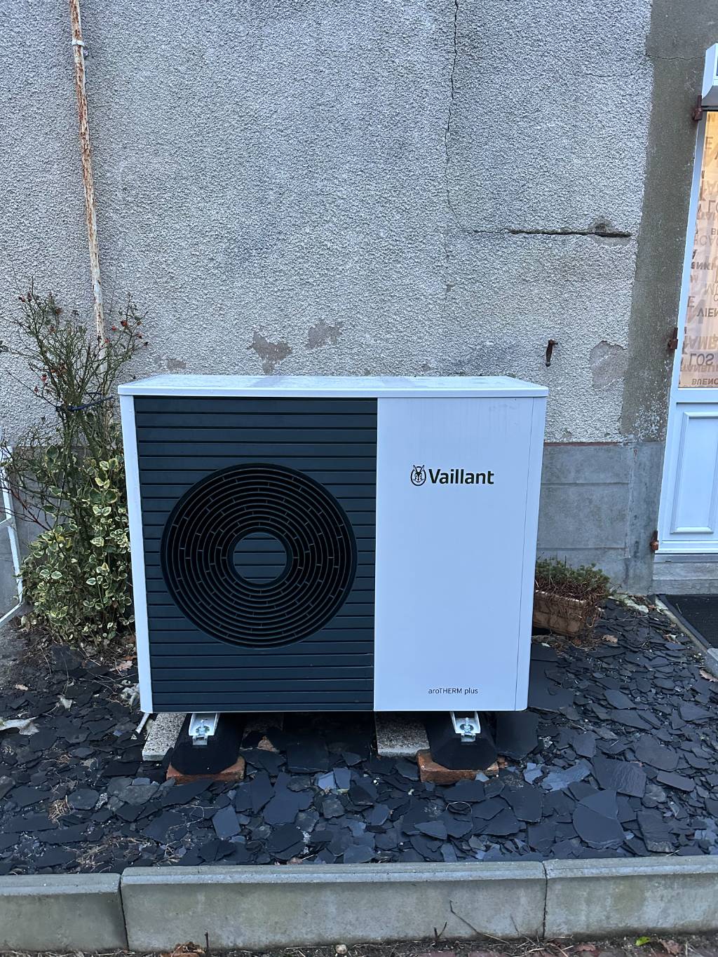 La Pompe à chaleur VAILLANT Arotherm Plus était adaptée à cette configuration grâce à son fonctionnement en haute température ( R290 ) monobloc et sa régulation en fonction de l'extérieure et programmation pat régulateur sonde d'ambiance.
