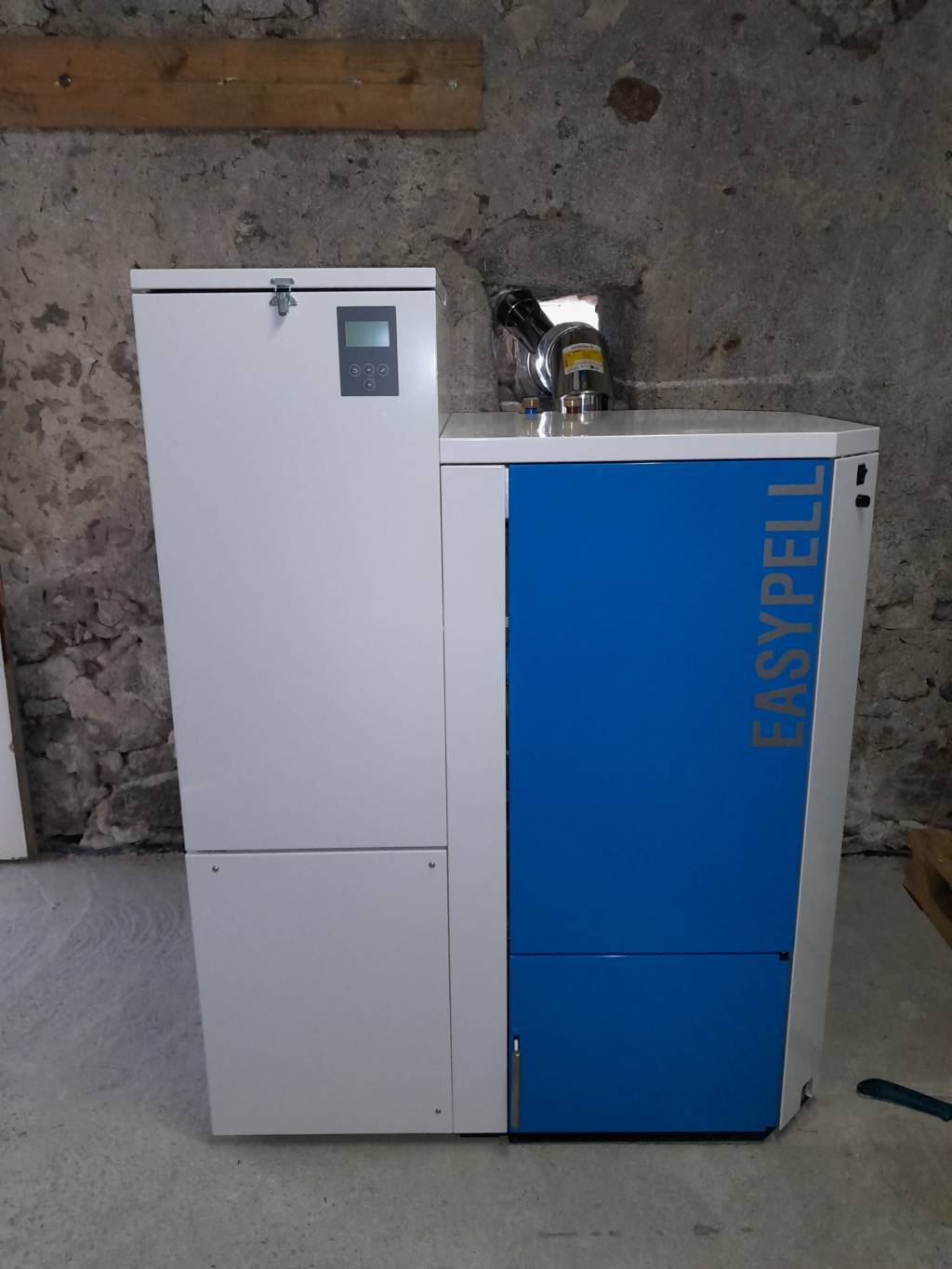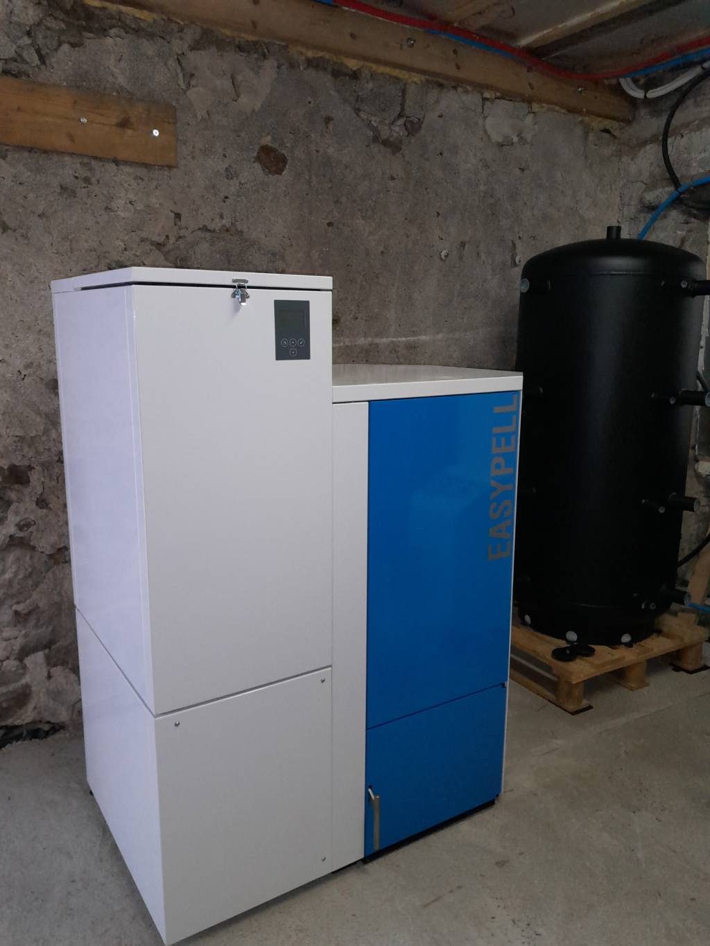 Cette chaudière ÖKOFEN Easypell est combinée avec les 2 pompes à chaleur via un ballon tampon. Elle vient en relais de celles-ci lorsque la température extérieure descend en dessous d'un seuil déterminé c'est à dire lorsque les pompes à chaleur ne suffisent plus ou que le rendement de celles-ci n'est plus un intérêt économique à cause du prix de l'électricité.